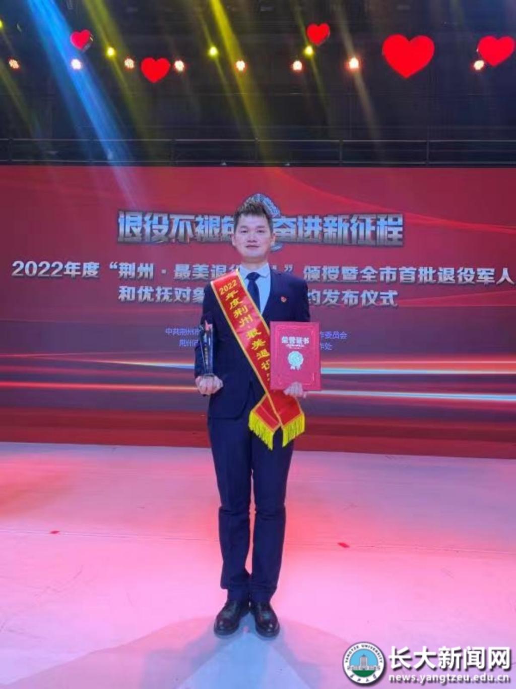 新闻网讯(通讯员 谢海红)2月24日,2022年度“荆州·最美退役军人”名单公布,公司太阳集团122cc博士研究生、退役军人叶泛获此殊荣,当天参加了在荆州广播电视台举办的颁授仪式。