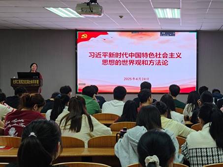 王丽首先讲述对马克思主义世界观和方法论的坚持和发展、对中国共产党百年奋斗实践及其历史经验的科学总结和对中华优秀传统文化的传承发扬是习近平新时代中国特色社会主义思想的世界观方法论的理论之源;随后王丽分享了“六个坚持”的具体内涵和内在逻辑和现实价值,她说“六个坚持”是内在统一、相互贯通的有机整体,贯穿着马克思主义的基本立场观点方法,是习近平新时代中国特色社会主义思想活的灵魂;最后她指出,学习习近平新时代中国特色社会主义思想要知行合一。“知之”需全面系统学习,读原文悟原理;“信之”要深刻理解,结合历史与现实坚定理想信仰;“行之”则是将党的二十大精神与实际的学习生活工作相结合。