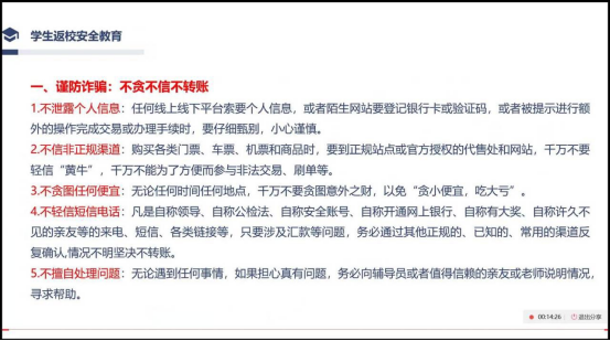 在安全教育方面,各班班主任从防电信诈骗、防溺水、防车祸、防借贷陷阱、防意外伤害五方面进行引导,强调个人反诈骗意识的重要性。切实提升员工对电信新型诈骗的防范意识和警惕性,增强员工的安全意识。