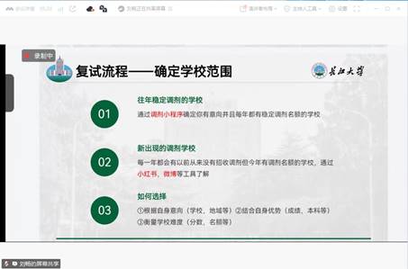 (通讯员 许多多)为进一步帮助考研学子了解复试流程,提高复试成功率,3月4日晚上,公司通过线上线下相结合的方式,在14教北201举办考研复试经验分享会。党委副书记杨会军,辅导员王娜出席会议。