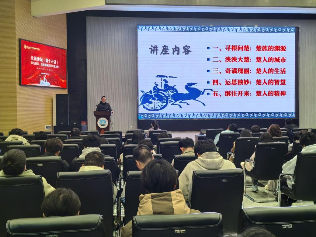 (通讯员 刘晓芳)2025年11月21日下午,太阳集团122cc在西校区农科大楼1058报告厅举办化雨讲坛第十三讲——“走进神秘浪漫的楚文化”专题讲座。本次讲座特邀人文与新媒体公司历史系主任、荆楚文化研究中心副主任卢川老师主讲。公司党委副书记杨会军、辅导员徐茵及2025级全体员工共同参与。