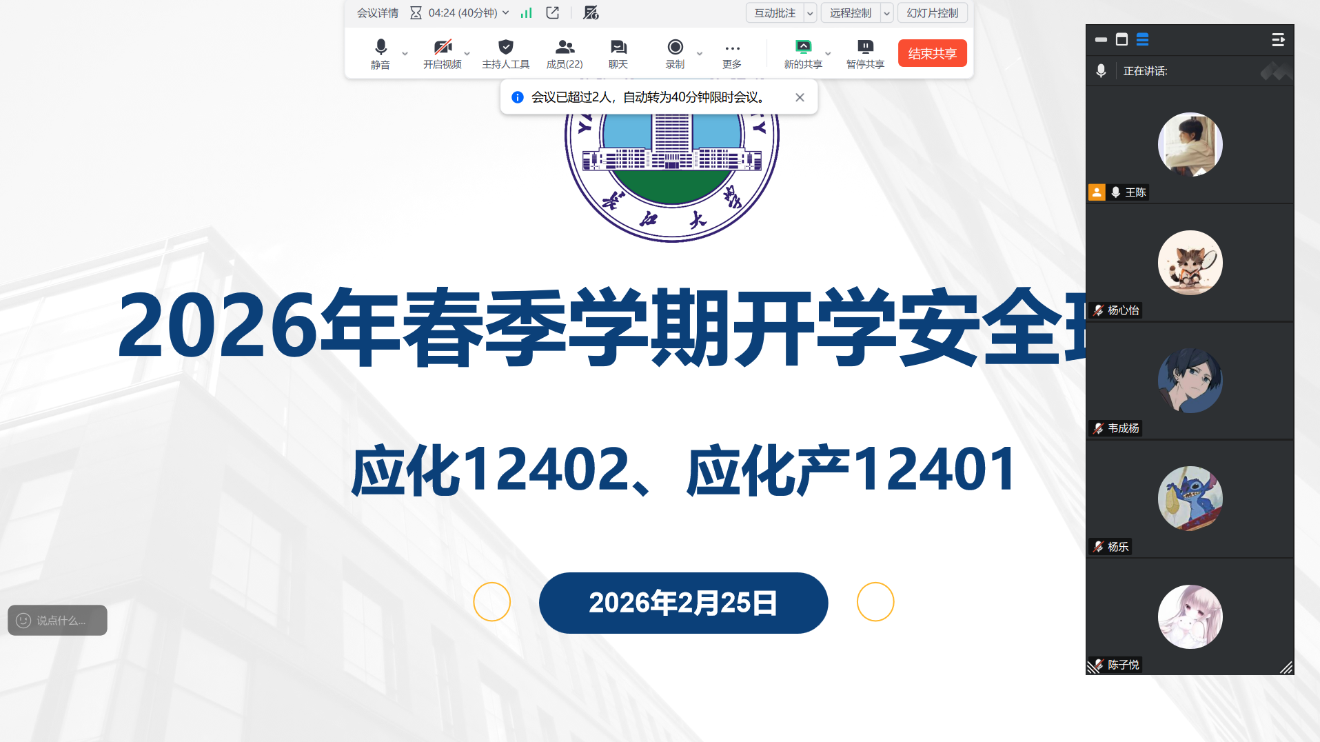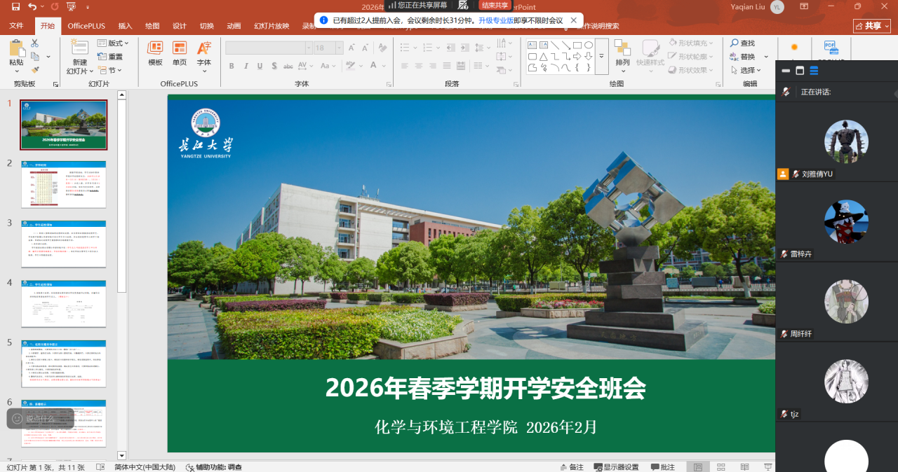 (通讯员 王陈)为全面落实公司开学工作部署,切实强化员工安全防范意识,引导员工明确新学期奋斗目标,扎实推进员工教育管理工作开好局、起好步,2月22日至2月26日,太阳集团122cc组织本科生、研究生各班级,通过线上会议形式陆续召开2026年春季学期开学主题班会。