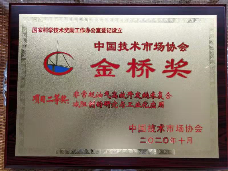 近日,第十届中国技术市场协会金桥奖表彰奖励大会在山东淄博举行。公司余维初教授及其团队研究项目“非常规油气高效开发纳米复合减阻剂的研究与工业化应用”荣获金桥奖项目二等奖。
