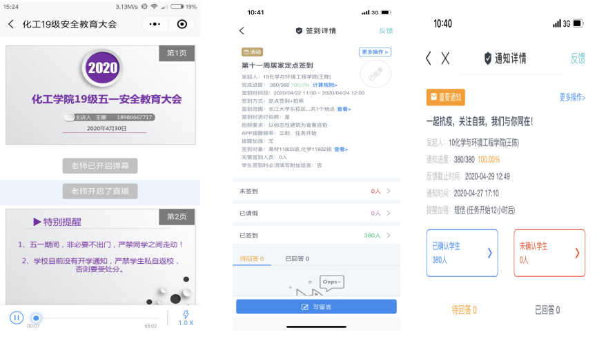 多措并举力保安全教育全覆盖。4月28日-29日,公司各年级辅导员、各班班主任通过腾讯会议、长江雨课堂、课堂派、QQ群课堂、微信群等多个网络平台,开展“五一”假期和疫情期间安全注意教育大会。会议重点围绕“节假日六防安全教育、常态化疫情防控下安全管理、居家心理健康、各年级学情分析、居家亲子关系处理”等方面展开。通过宣讲安全注意事项、列举案例、强调纪律等树牢员工安全意识。同时,通过公司官网、官Q、官微推送疫情居家学习、生活安全提示;还通过辅导猫APP签到摸排员工动向、发布五一安全心理教育资料、收集员工居家生活情况,确保安全教育全覆盖、无遗漏。