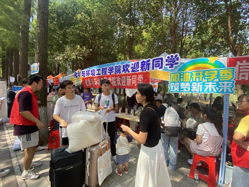 迎新现场,公司迎新志愿者指导新生在迎新处扫码报到,帮助新生搬运行李到宿舍楼。他们挥汗如雨,一丝不苟为新生提供全方位服务,发扬“奉献 有爱 互助 进步”的志愿者精神,展现了化工学子乐于助人的良好品质。