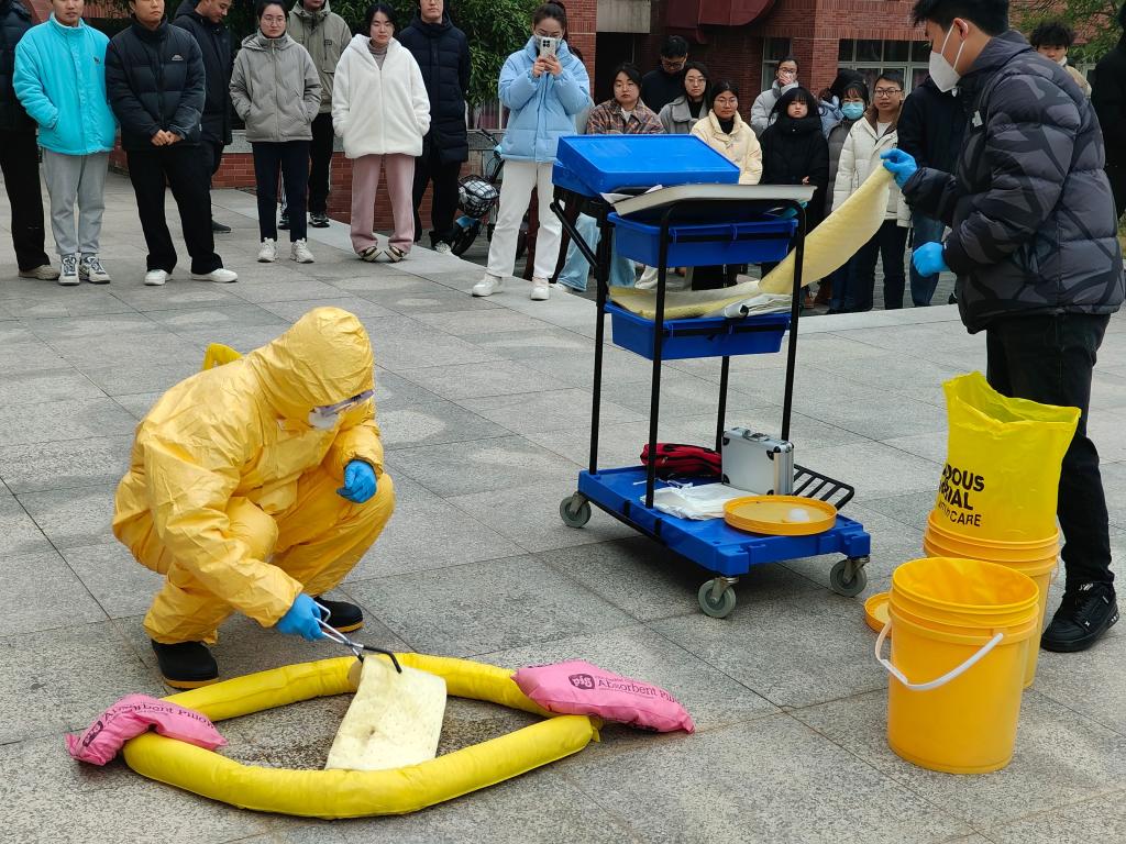 危险化学品泄漏应急处理演练中,通过模拟浓硫酸泄漏应急处理场景,详细展示了人群疏散、防护装备穿戴及专业处置流程等应急措施。师生们认真观摩后踊跃参与模拟操作,熟悉应急处理流程,提升了应对突发危险的能力。