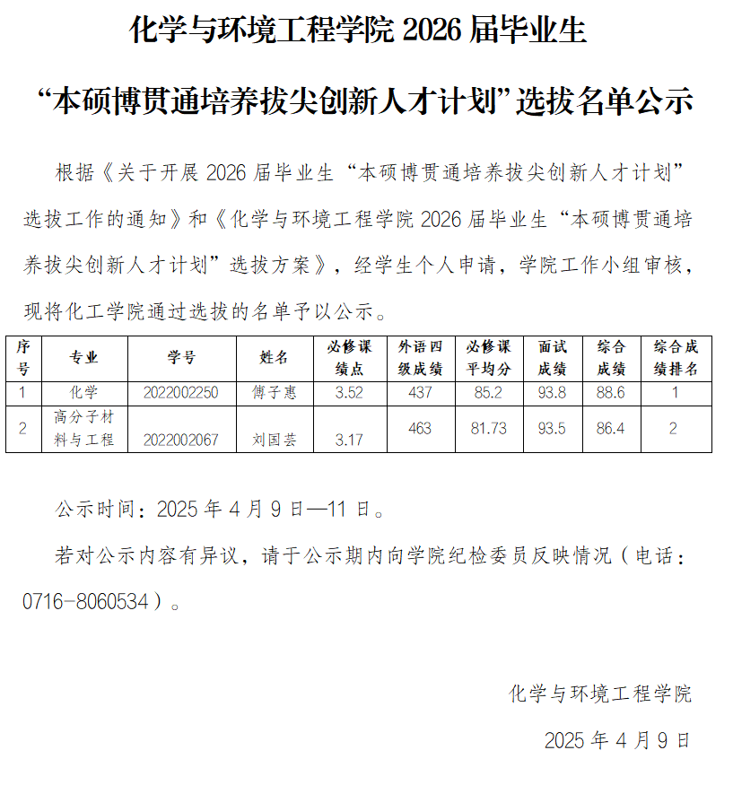 2026届毕业生“本硕博贯通培养拔尖创新人才计划”选拔名单公示