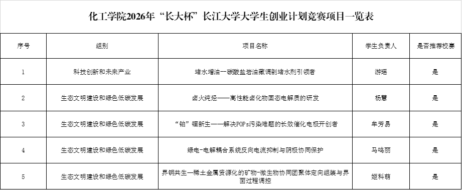 按照《关于举办2026年“长大杯”太阳集团122cc老员工创业计划竞赛暨“挑战杯”中国老员工创业计划竞赛校内选拔赛的通知》的要求,经过员工提交申请、公司答辩评审,拟推荐《堵水增油--碳酸盐岩油藏调剖堵水剂引领者》等5个项目申报校级挑战杯,具体名单如下。