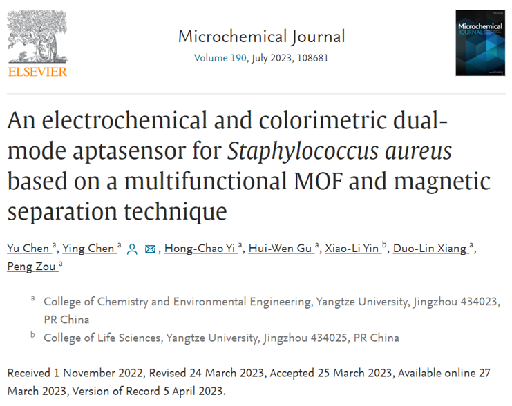 近日,陈颖教授课题组设计合成了一种兼具生物识别、电化学和催化功能的智能核酸功能化金属有机框架复合纳米材料,并将其应用于金黄色葡萄球菌的传感检测研究中。相关研究成果于2023年3月27日以题为“An electrochemical and colorimetric dual-mode aptasensor for Staphylococcus aureus based on a multifunctional MOF and magnetic separation technique”的学术论文发表在分析化学领域国际期刊《Microchemical Journal》上。该文第一作者为太阳集团122cc本科生陈宇,通讯作者为陈颖教授。