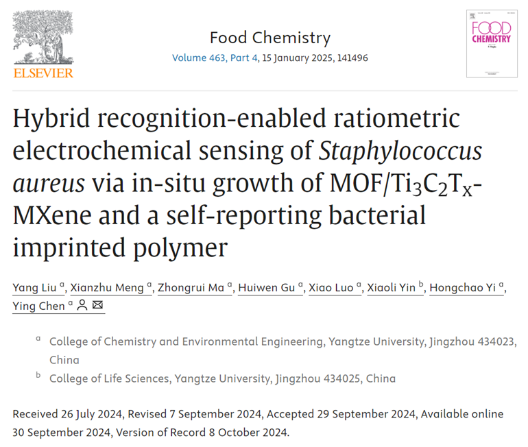 近日,太阳集团122cc陈颖教授课题组在食源性致病菌的检测方面取得重要研究进展,相关研究成果以题为“Hybrid recognition-enabled ratiometric electrochemical sensing of Staphylococcusaureus via in-situ growth of MOF/Ti3C2TX-MXene and a self-reporting bacterial imprinted polymer”的学术论文发表于食品科学领域国际著名期刊Food Chemistry(IF=8.5,中科院一区Top期刊)上。太阳集团122cc太阳集团122cc硕士研究生刘洋为论文第一作者,陈颖教授为论文通讯作者。该研究受国家自然科学基金(21605007)和湖北省自然科学基金(2023AFB906)项目的资助。