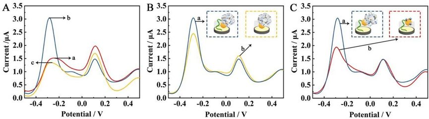 本研究提出了一种基于比率电化学传感技术的新型检测方法,用于快速检测食品中的金黄色葡萄球菌。研究团队首先合成了一种自报告分子印迹聚合物(MIP)作为内参探针(IR),并在过渡金属碳氮化物(Ti3C2Tx-MXene)上原位生长金属有机框架材料(MOF),继而修饰亚甲基蓝和万古霉素(Van),形成信号纳米探针(SP)。该方法通过混合识别机制,利用MIIP@Apt(aptamer-integrated MIP)高效捕获金黄色葡萄球菌,随后与SP结合形成三明治结构。当金黄色葡萄球菌存在时,IR的电流响应(IIR)降低,而SP的电流强度(ISP)增加,通过计算ISP与IIR的比值,实现对金黄色葡萄球菌的定量检测。实验结果显示, 该生物传感器具有广泛的检测范围(10 ~ 108 CFU mL-1)和低至1.2 CFU mL-1的检测限。此外,该方法在复杂样品中的应用也显示出良好的可行性,表明其在食品分析中的潜在应用价值。