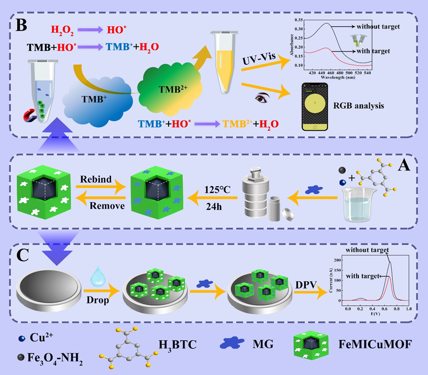陈颖教授课题组开发的FeMICuMOF材料结合了Fe3O4核和铜基MOF涂层,具有特异性结合MG的位点。该设计通过磁性分离简化操作,减少复杂基质的干扰,并通过电化学和催化活性实现双模式信号转导。实验结果表明,FeMICuMOF对MG具有优异的选择吸附性能,最大吸附容量为7.5 mg/g。此外,FeMICuMOF展现出优异的过氧化物酶模拟活性,能够催化TMB/H2O2体系产生颜色变化,且MG的存在会抑制这种催化活性,从而实现MG的比色检测。电化学检测结果表明,FeMICuMOF修饰的玻璃碳电极在[Fe(CN)6]3-/4–溶液中表现出明显的电化学活性,MG的存在导致特征电流响应降低,可用于MG的电化学定量分析。